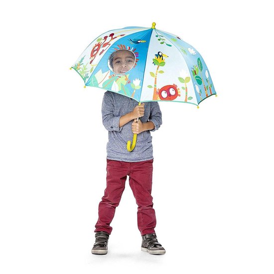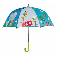 Lemur George umbrella by Belgian Lilliputiens – the umbrella has cheerful, bright colourful patterns that children love. There is a transparent window that allows your little one to be able to see where he/she is going with this and Look!! Lilliputiens makes a walk in the rain fun.