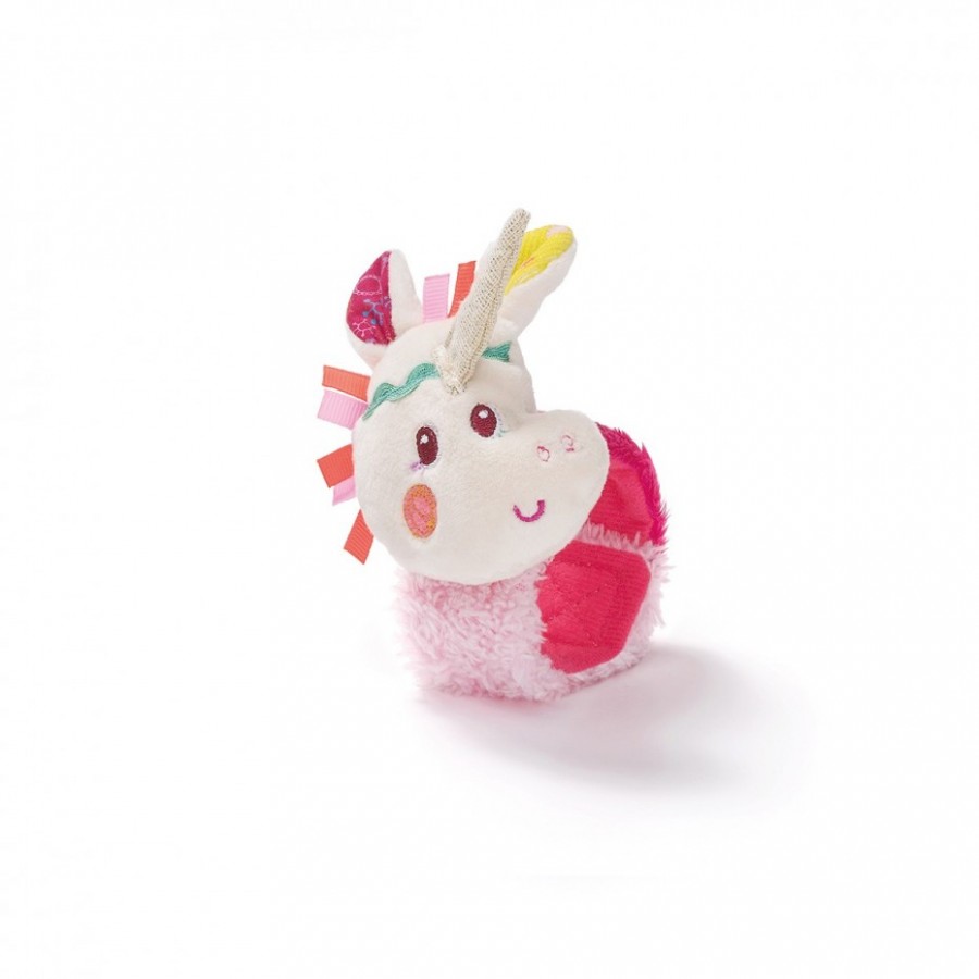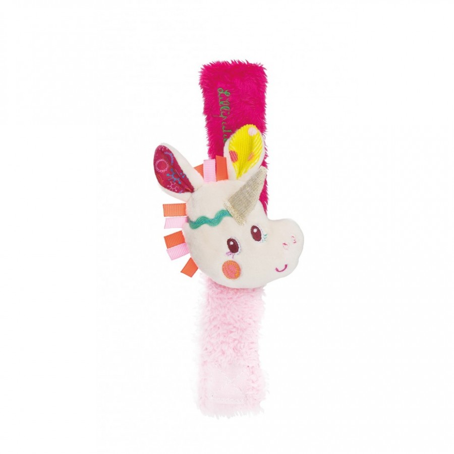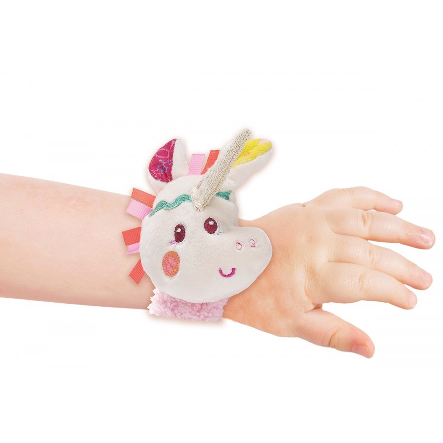 Endearing little Louise the unicorn bracelet from Lilliputiens brand to strap to your baby’s wrist… she will activate the sounds by moving her arms. She also has a paper crunch noise on the strap to play.